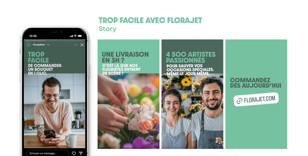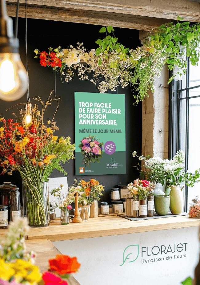 Faire de “Florajet.com" un réflexe au quotidien, pas seulement lors de la Saint-Valentin ou de la Fête des Mères et valoriser autant son efficacité, la livraison de fleurs en moins de 3 heures, partout en France, que sa personnalité audacieuse.